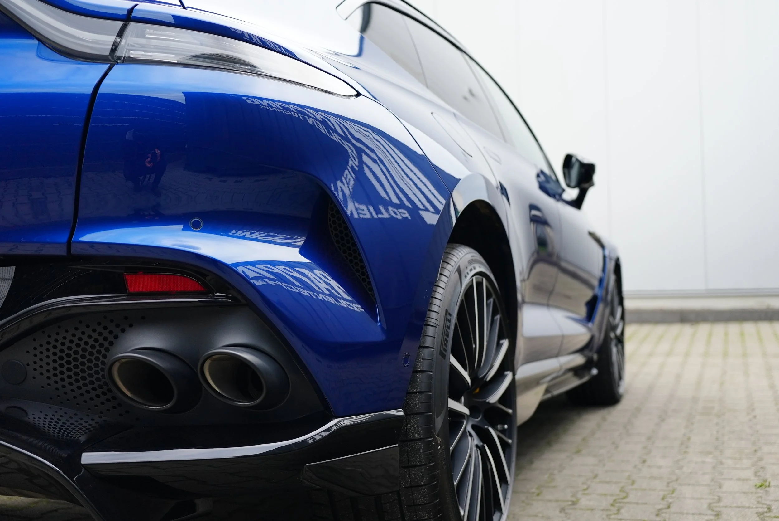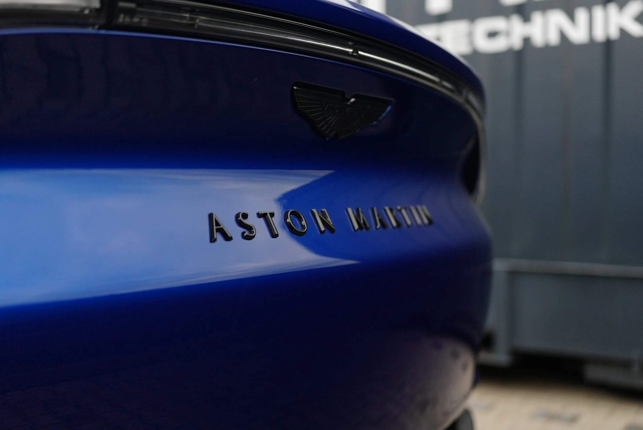 Ein schwarner Aston Martin mit offenem Motorhaube im Autohaus, mit Schutzabdeckungen an den Reifen.
